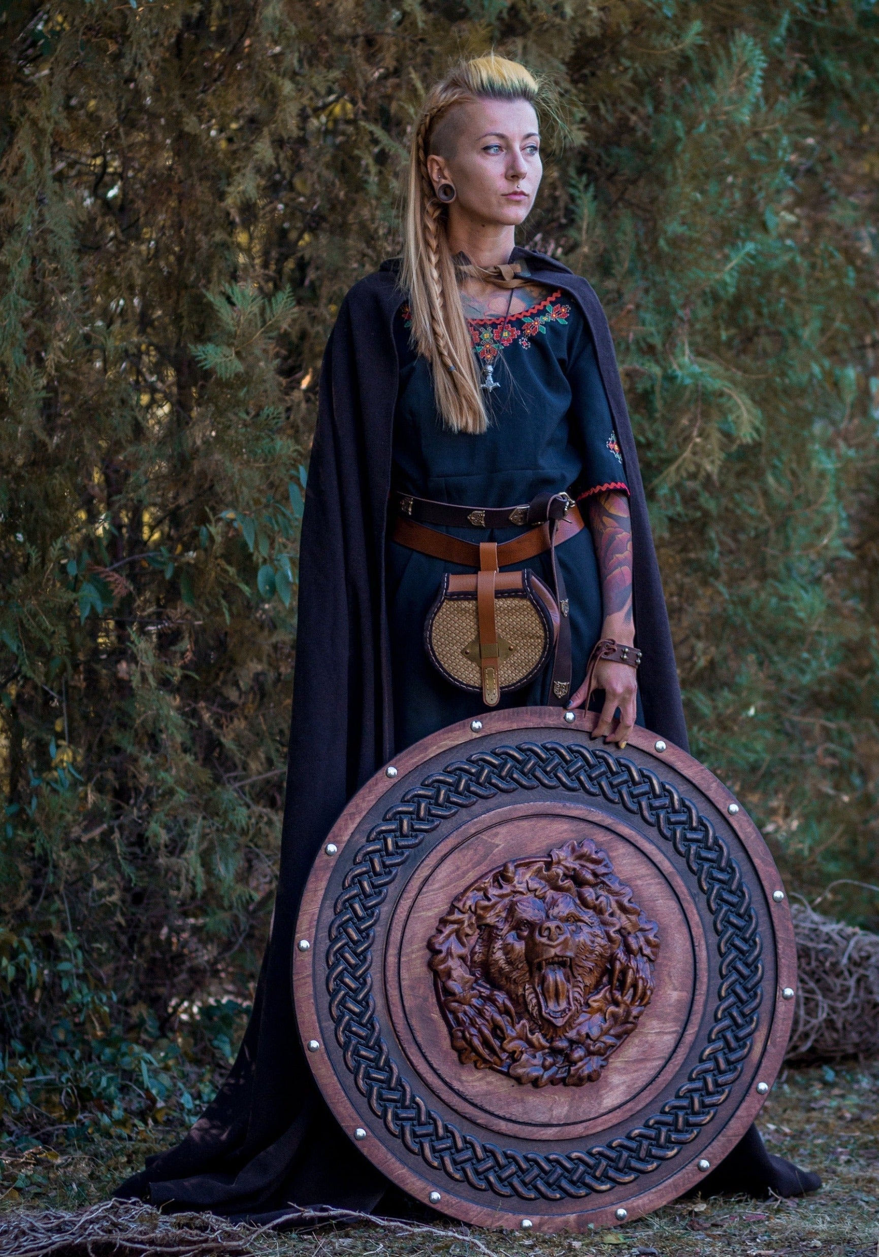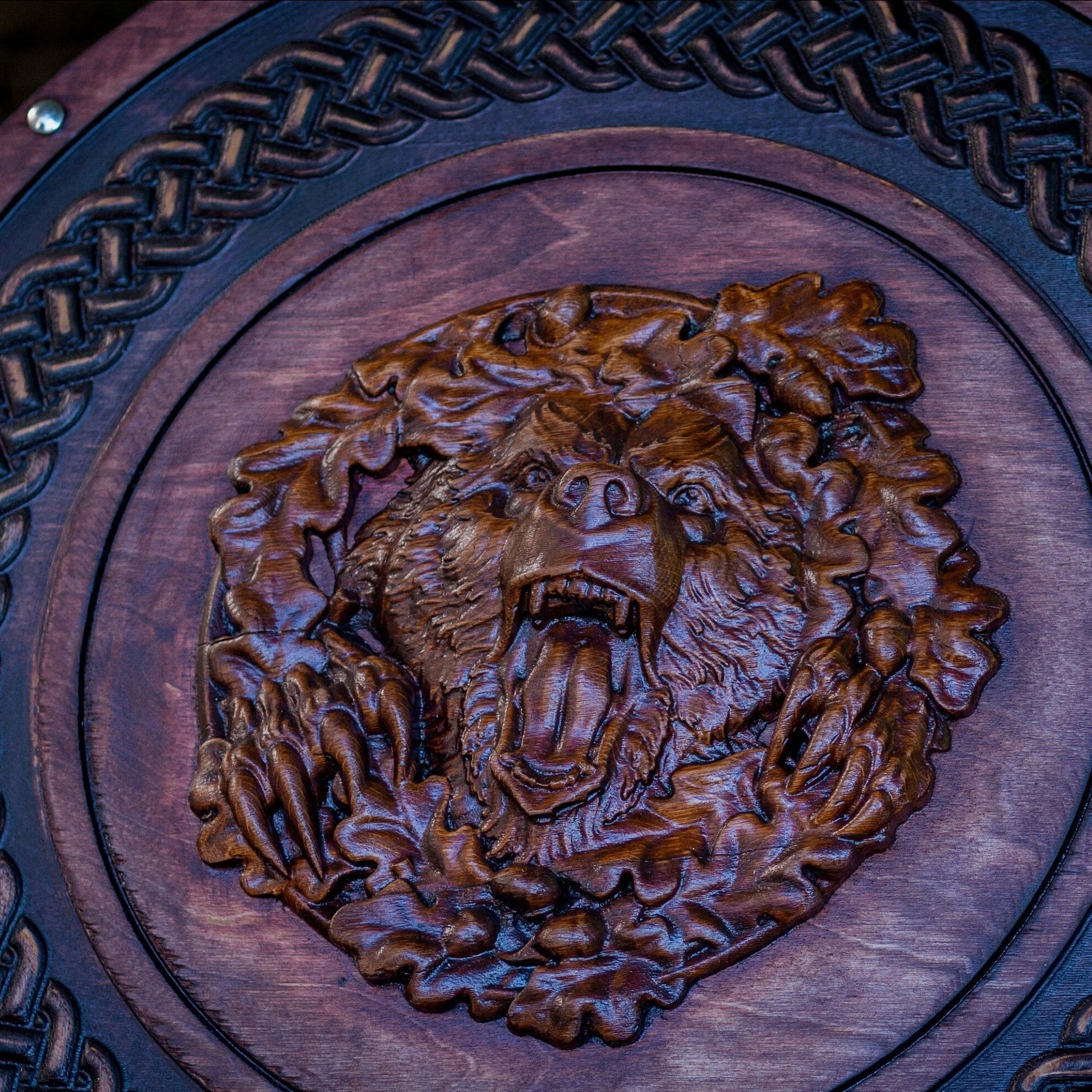 - This shield features a bear head carved in oak wood, attached to the center of the plywood base, with ornamental relief carved along the rim and decorative steel bolts.