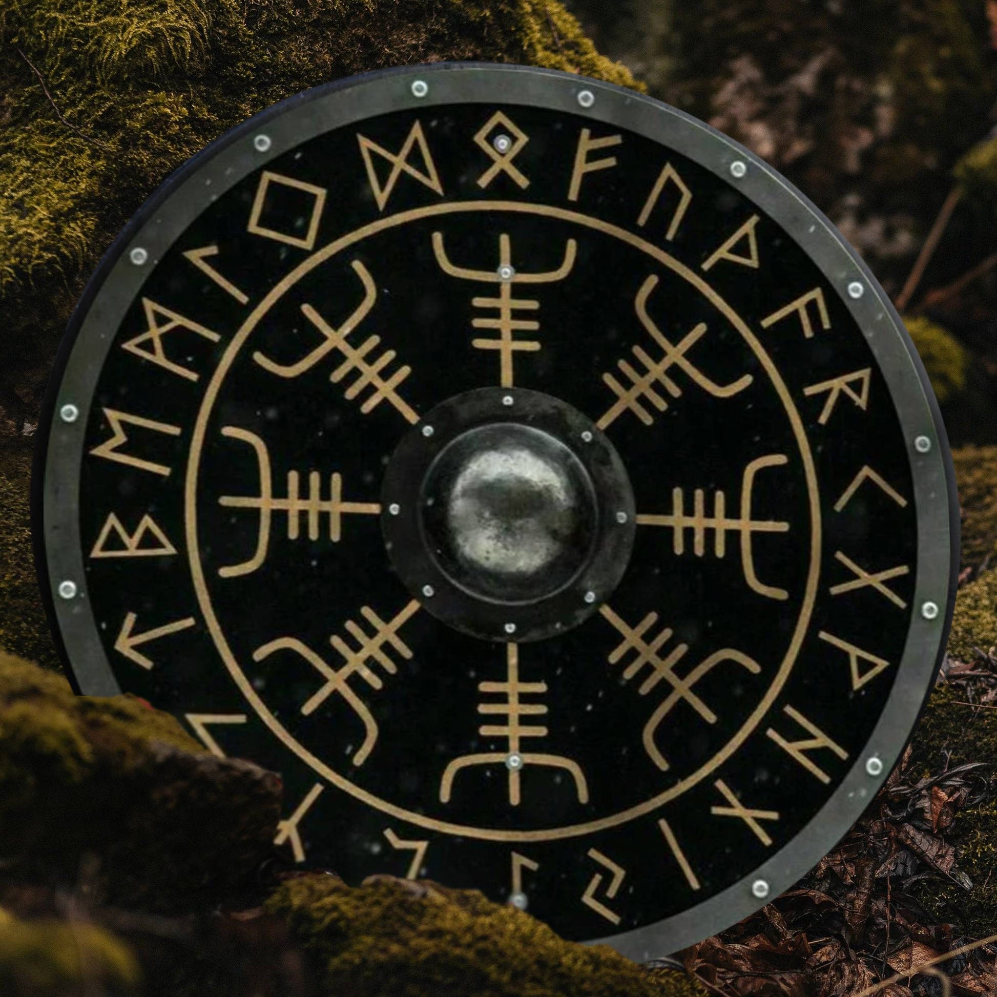 Smooth Wood & Steel Viking Shield with Helm of Awe Symbol, 24"