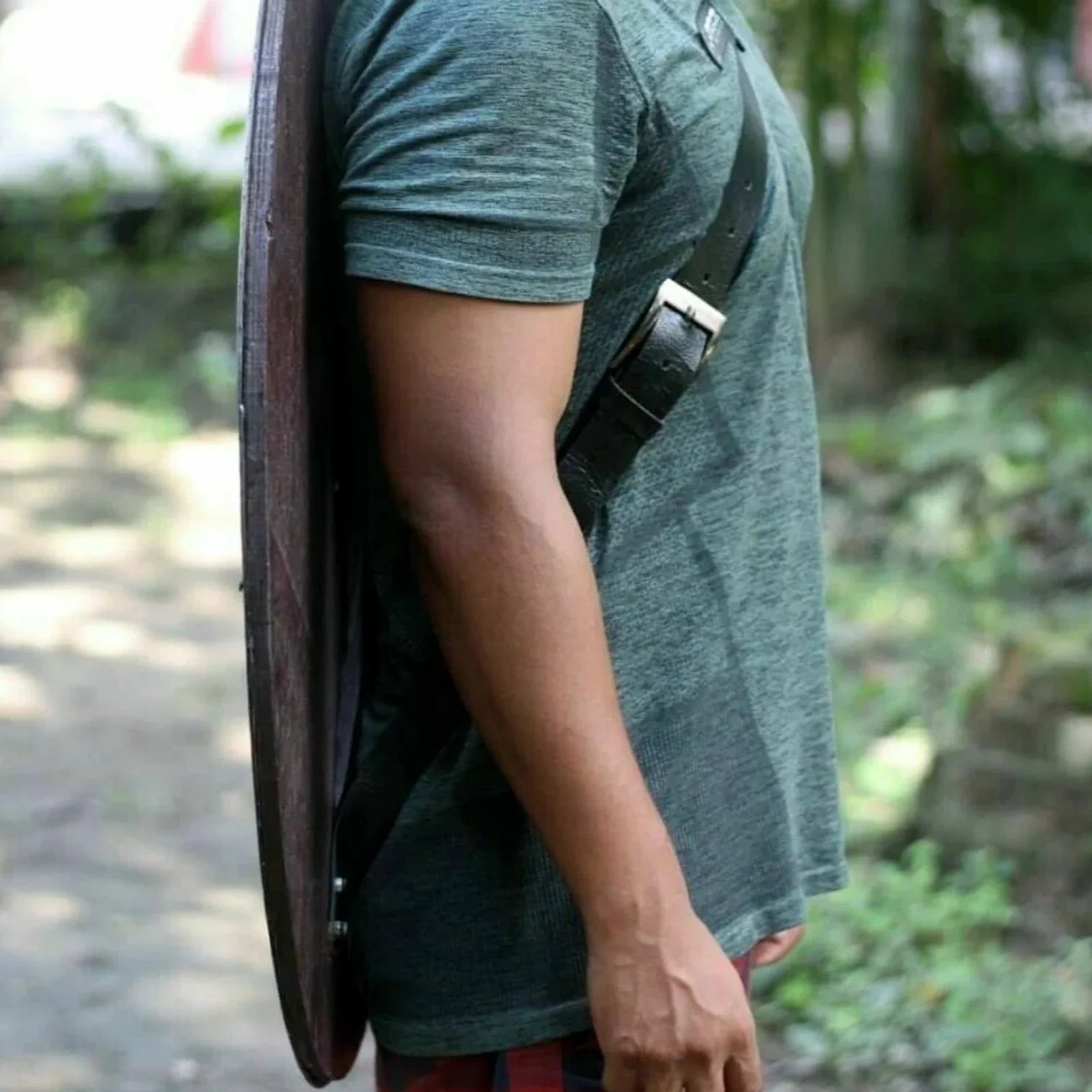 - The shield is made out of thick birch plywood, painted, and smoothed by hand. It is consolidated with a steel hand-hammered umbo and bolts. It comes with a wood handlebar installed on the back.